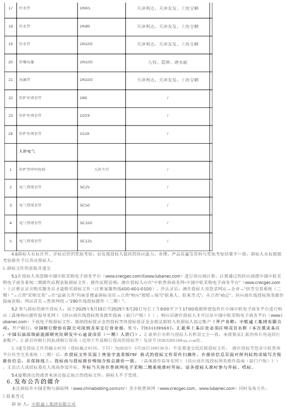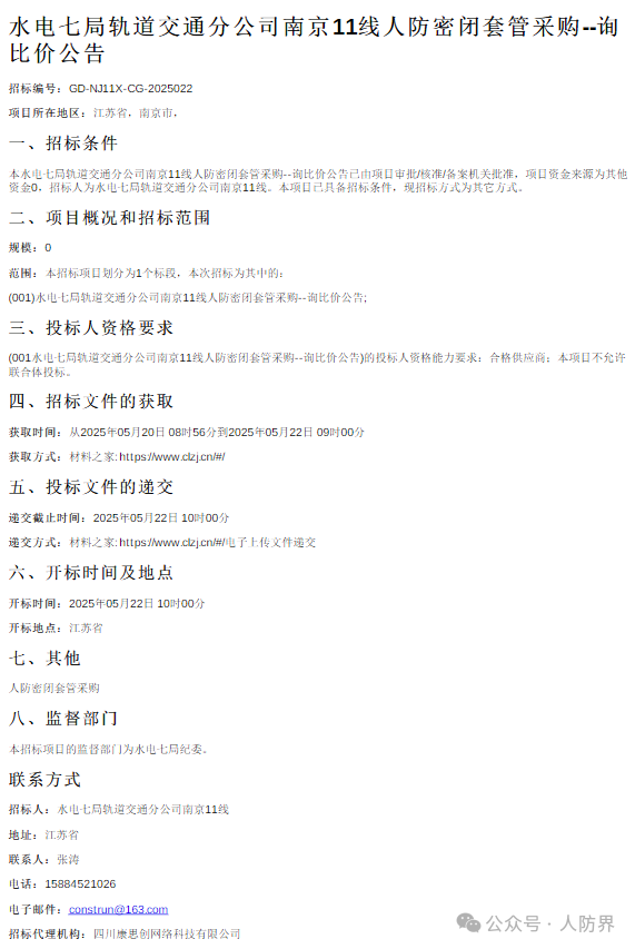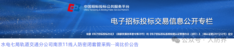 水电七局轨道交通分公司南京11线人防密闭套管采购--询比价公告河南省