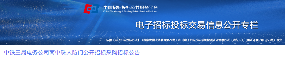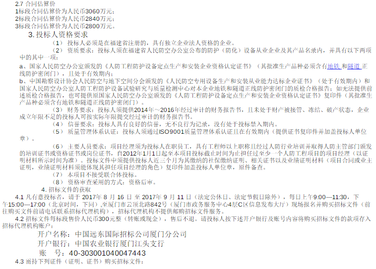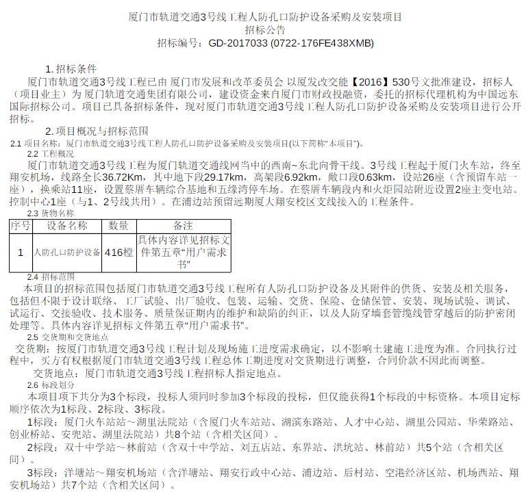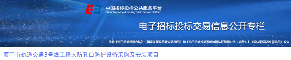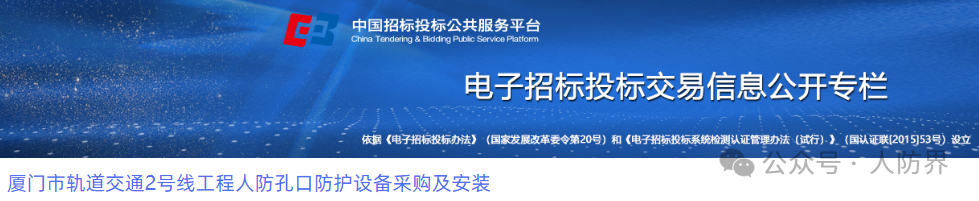 厦门市轨道交通3号线工程人防孔口防护设备采购及安装项目