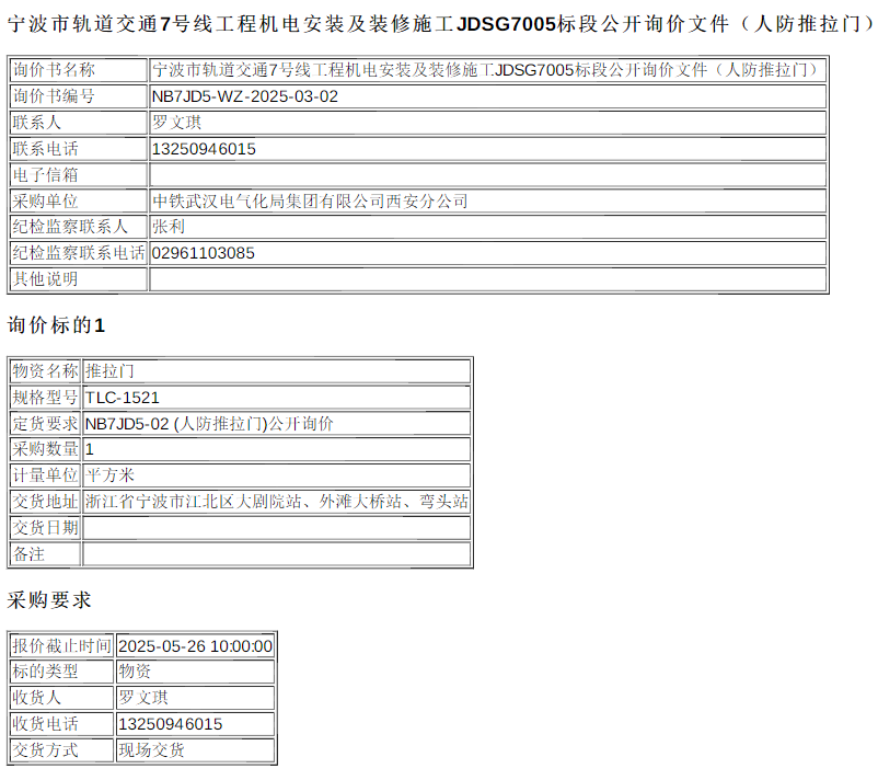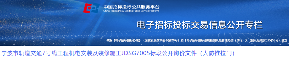 宁波市轨道交通7号线工程机电安装及装修施工JDSG7005标段公开询价文件(人防推拉门)重庆市