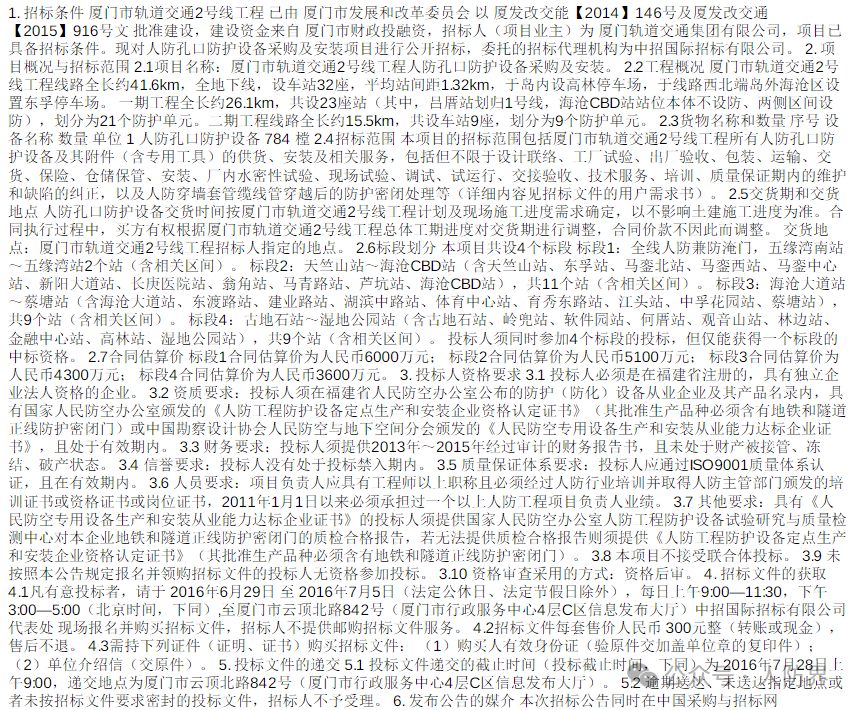 厦门市轨道交通2号线工程人防孔口防护设备采购及安装